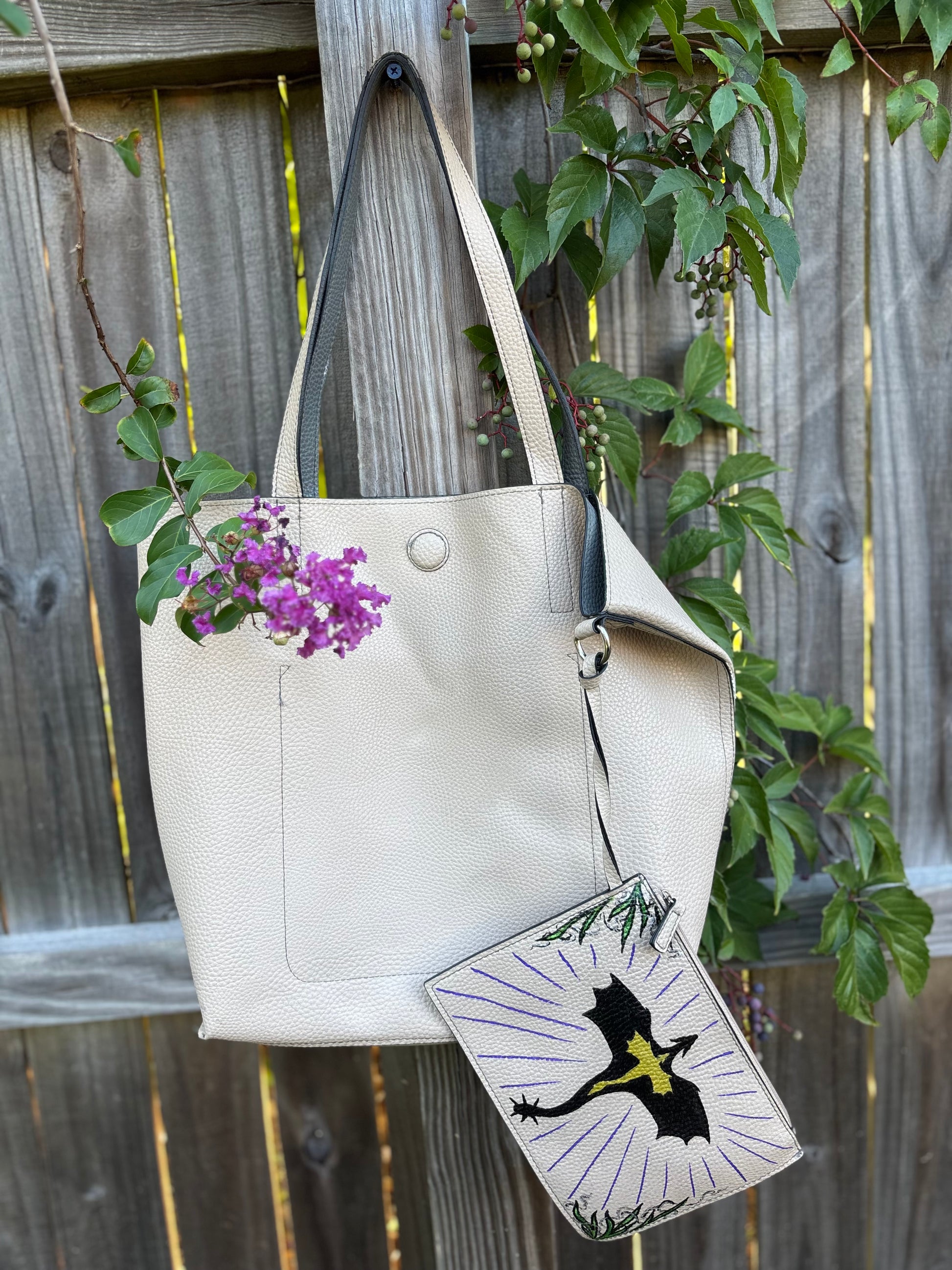 This large tote is painted with violets and split in two with the words “Morally Gray”. Attached is a smaller bag for all your extras, perfect for a conduit or a self-writing ink pen.